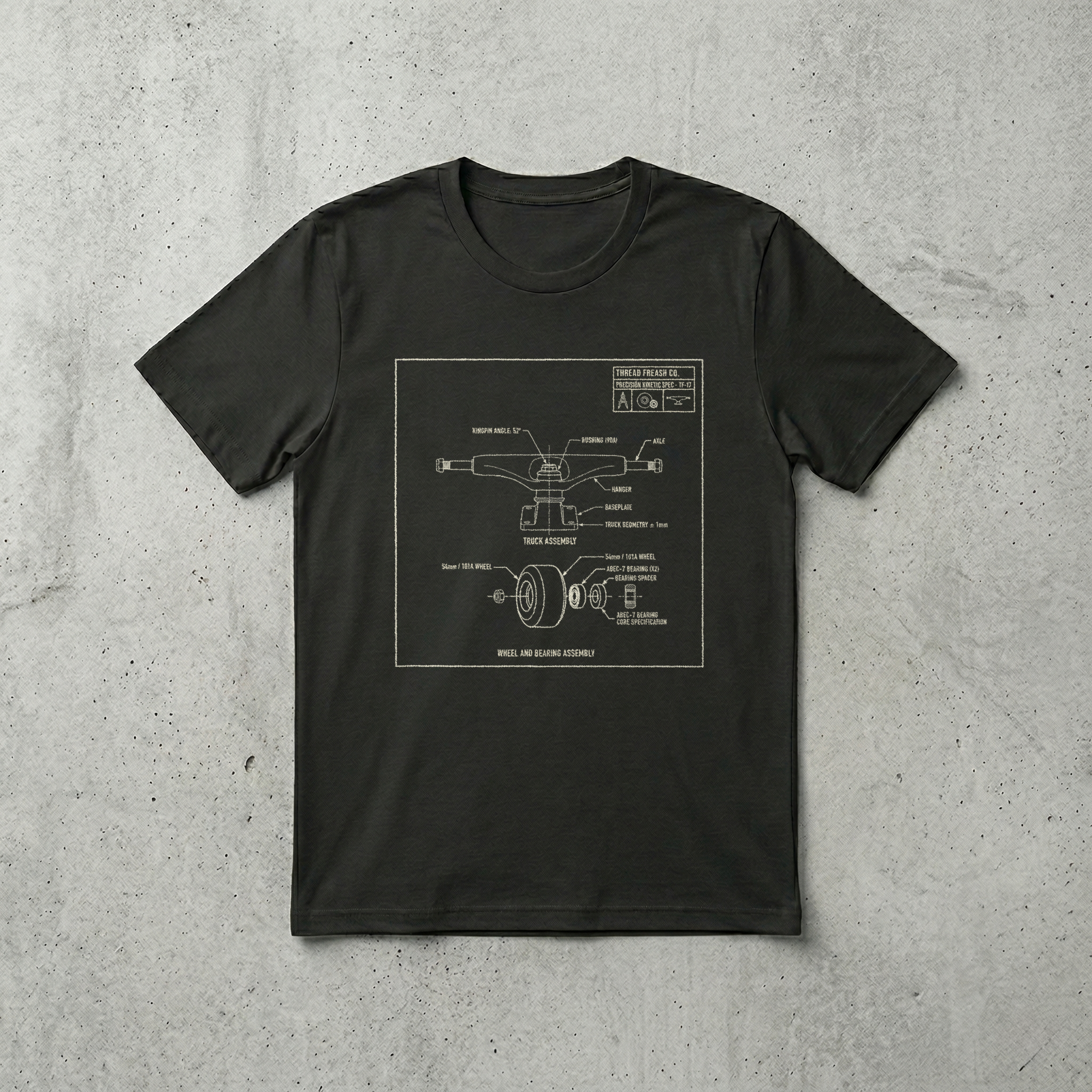 The beauty is in the breakdown. Our TF-17 Kinetic Spec Tee showcases the internal mechanics of a skateboard truck and wheel assembly. From the $52^\circ$ kingpin...Regular price $25.00 USDSale price $25.00 USD Regular priceUnit price / per -